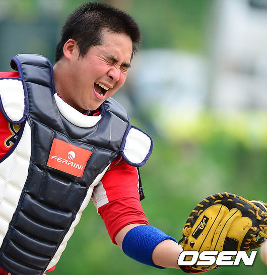 알바트로스 포수 이종섭이 파울플라이를 놓치고 아쉬워 하고 있다.