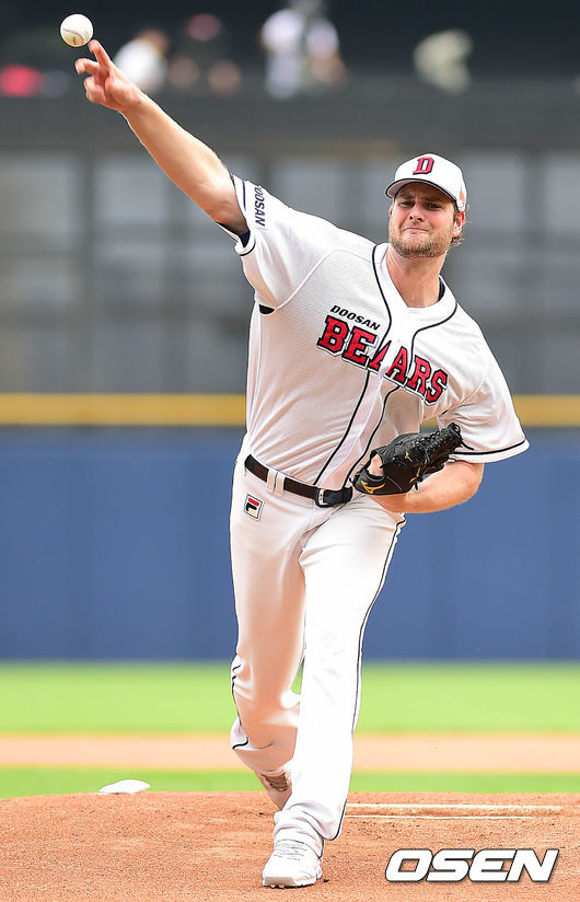 두산 선발 볼스테드가 힘차게 공을 뿌리고 있다.