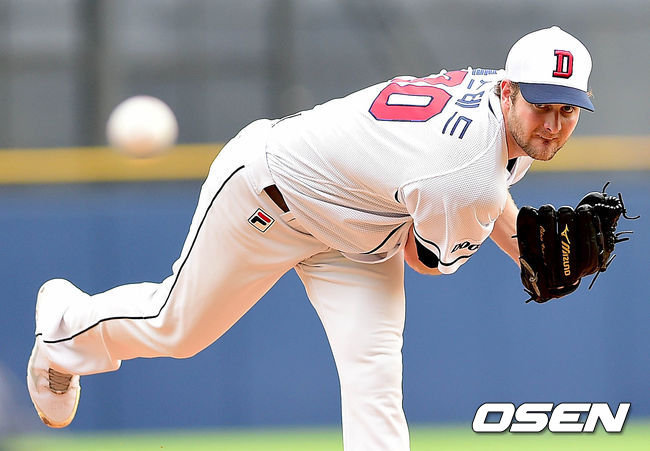두산 선발 볼스테드가 힘차게 공을 뿌리고 있다.