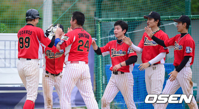 알바트로스 조연우가 6회말 1사 주자 2루 마지막 공격에서 자존심을 세우는 투런포를 쏘아 올리고 선수들과 기쁨을 나누고 있다.