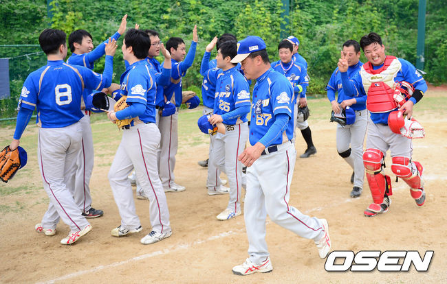 지오스포츠야구단이 알바트로스 상대 승리를 챙긴후 선수들이 승리의 기쁨을 나누고 있다.