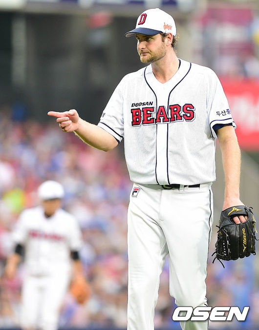 2회초 삼성 공격을 무실점으로 막아낸 두산 선발 볼스테드가 더그아웃으로 들어오며 포수 최재훈에게 인사를 건네고 있다.