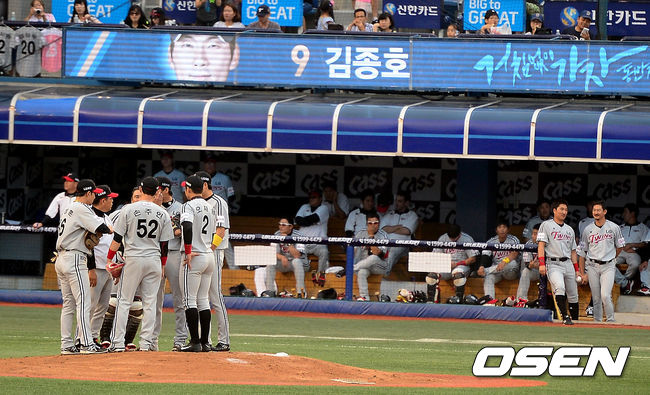 2회말 2사 만루에서 LG 양상문 감독이 마운드에 올라 선수들과 이야기를 나누고 있다.