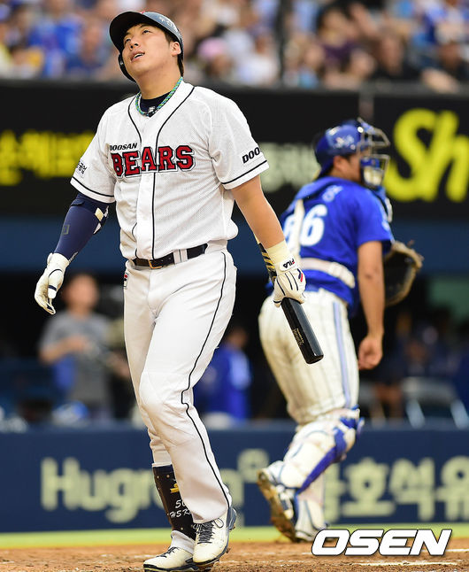 3회말 두산 공격 2사 주자없는 상황 삼성 선발 밴덴헐크의 공에 삼진을 당한 김현수가 아쉬워하며 더그아웃으로 향하고 있다.
