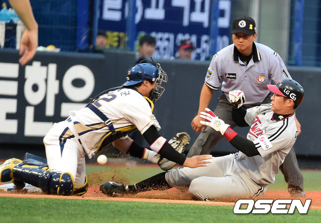 4회초 무사 1루에서 LG 오지환이 손주인의 3루땅볼에 3루까지 내달리며 NC 김태군과 충돌하고 있다. 오지환은 3루에서 세이프.