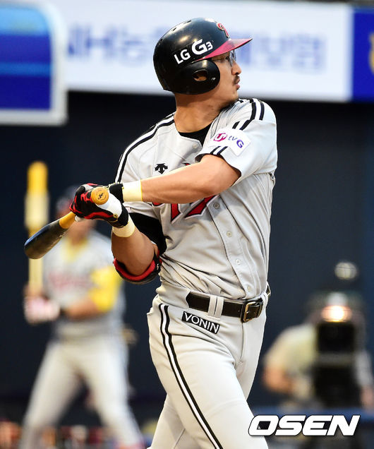 4회초 1사 3루에서 LG 박용택이 선제 1타점 중전 적시타를 날리고 있다.