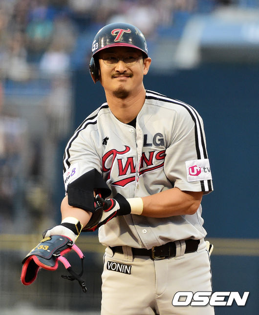 4회초 1사 3루에서 LG 박용택이 선제 1타점 중전 적시타를 날리고 미소짓고 있다.