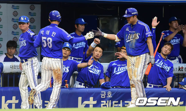 4회초 삼성 공격 1사 3루 상황 김상수의 1타점 좌익수 희생플라이 때 홈을 밟은 박해민이 류중일 감독을 비롯한 코칭스태프, 더그아웃 동료들과 인사를 나누고 있다.