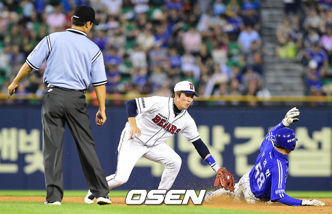 6회초 삼성 공격 2사 1루 상황 박해민이 2루 도루에 성공하고 있다. 두산 유격수는 허경민.