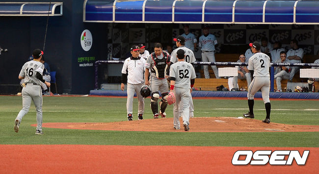 2회말 2사 만루에서 LG 양상문 감독이 마운드에 올라 선수들과 이야기를 나누고 있다.