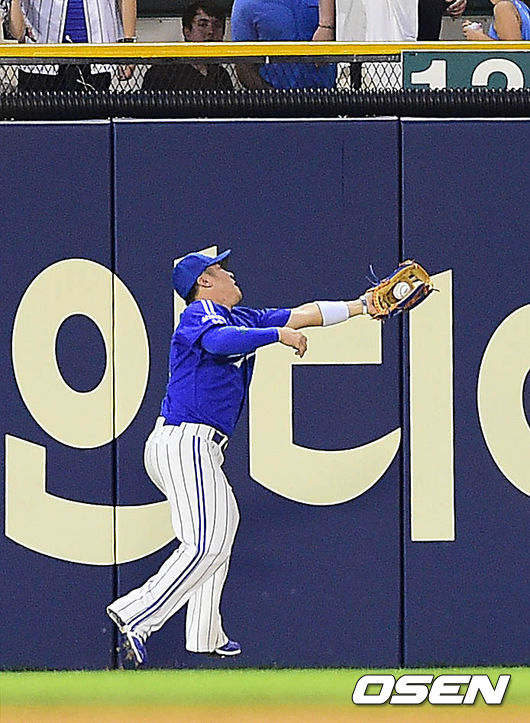 6회말 두산 공격 선두타자로 나선 민병헌의 타구를 삼성 좌익수 최형우가 끝까지 쫓아가 멋지게 잡아내고 있다.