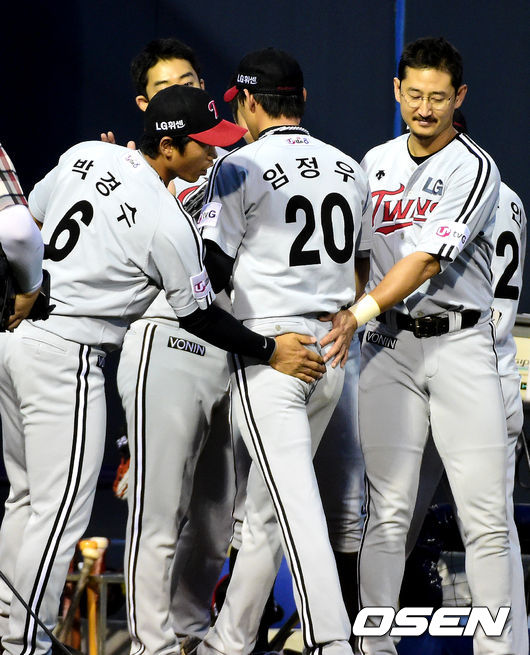 5회말 수비를 마친 LG 임정우가 박경수, 박용택의 격려를 받으며 더그아웃으로 향하고 있다. 임정우는 5이닝 무실점 호투중.