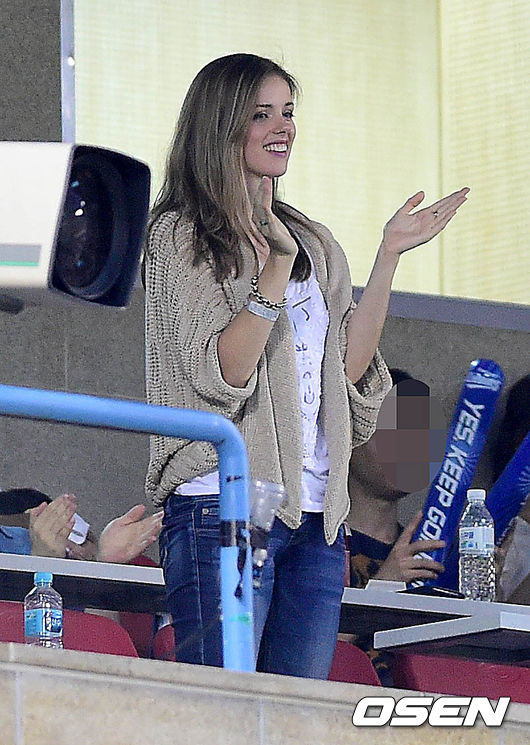 6회말 두산 공격을 실점 없이 막아낸 삼성 선발 밴덴헐크를 향해 부인인 애나가 박수를 보내고 있다.