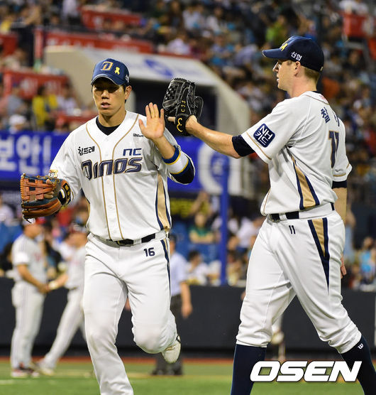 6회초 2사 만루에서 NC 찰리가 LG 정성훈을 3루 땅볼 병살로 처리하며 모창민과 하이파이브를 하고 있다.