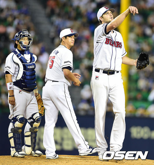 7회초 삼성 공격 무사 1, 2루 상황에서 두산 선발 볼스테드가 마운드를 내려오고 있다.