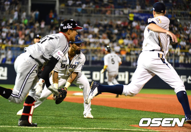 7회초 1사 1루에서 LG 임재철이 보내기 번트를 시도하며 1루로 전력질주하고 있다. NC 테임즈가 1루 타구를 잡아 베이스 커버 들어가는 찰리에 송구하고 있다.