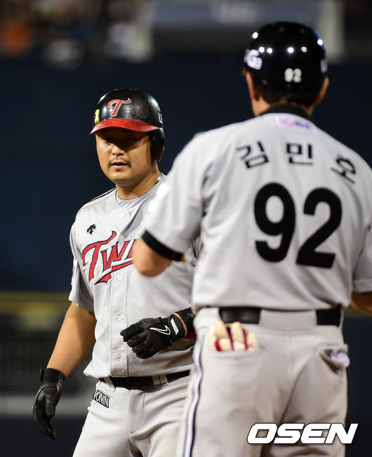 7회초 2사 2루에서 LG 최경철이 1타점 적시타를 날리고 김민호 코치와 기뻐하고 있다.