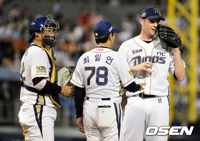 7회초 2사 2루에서 NC 찰리가 강판당하고 있다.
