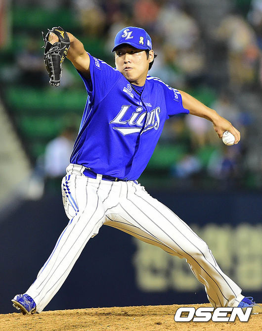 9회말 두산 공격 때 마운드에 오른 삼성 투수 차우찬이 힘차게 공을 뿌리고 있다.