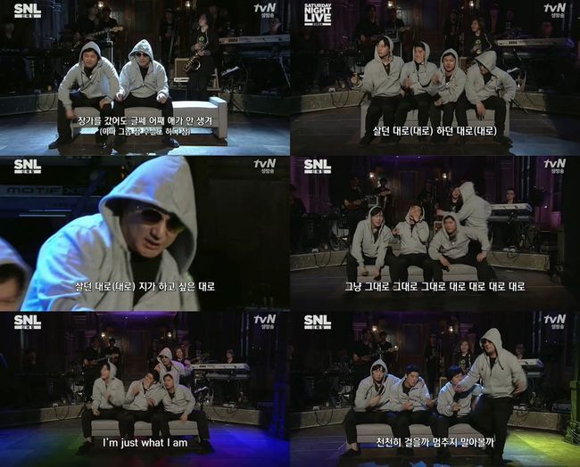 이날 방송에서 신해철은 회색 후드를 입은 채 'SNL 코리아' 크루들과 함께 자신의 노래 '아따(A.D.D.A)'를 불렀다.