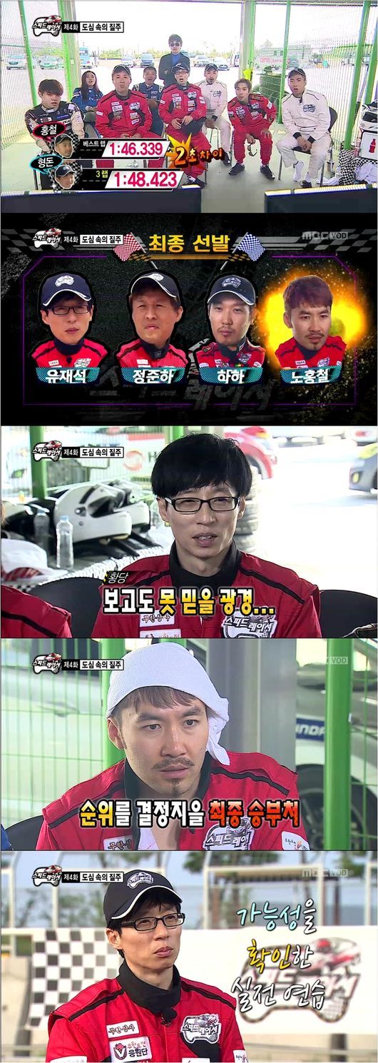 ‘무한도전’은 지난 5일 방송된 스피드 레이서 특집에서 코리아스피드페스티벌(KSF) 출전을 위해 피땀 어린 노력을 하는 멤버들의 모습을 공개했다. 지난 4월 프로선수들과의 대결 방송 이후 2달여 만에 공개한 KSF 출전 과정은 무한 연습 뿐이었다. 대회 출전 멤버가 유재석, 정준하, 노홍철, 하하로 결정된 가운데 멤버들은 시간 단축을 위해 달리고 또 달렸다.