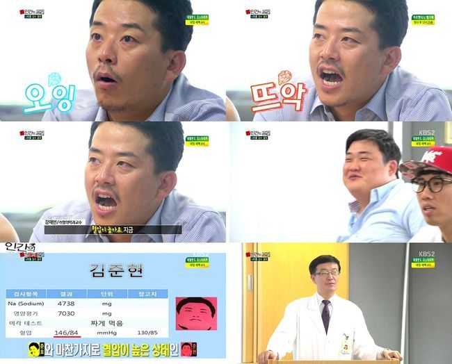 김준호와 김준현은 5일 오후 방송된 KBS 2TV '인간의 조건'에서 나트륨 과다 섭취 결과를 받아들며 고혈압 판정도 받았다.