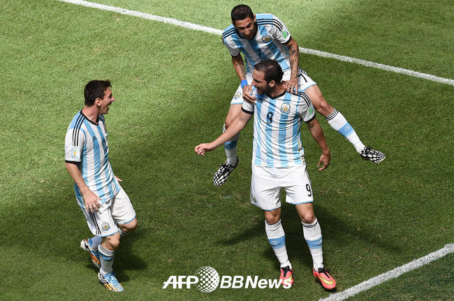 전반 아르헨티나 곤살로 이과인이 골을 성공시키고 동료들과 환호하고 있다.