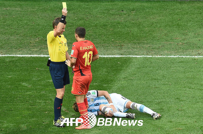 벨기에 에당 아자르가 경고를 받고 있다. /photo@osen.co.kr