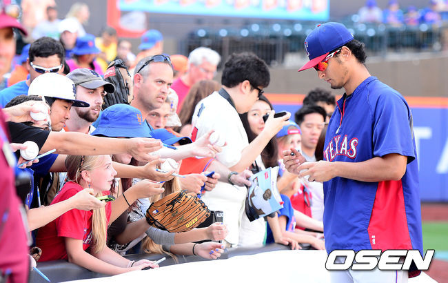 6일(이하 한국시간) 미국 뉴욕주 뉴욕 퀸스 시티 필드에서 열리는 '2014 메이저리그' 뉴욕 메츠와 텍사스 레인저스의 경기에 앞서 텍사스 다르빗슈가 팬들에게 사인을 해주고 있다.