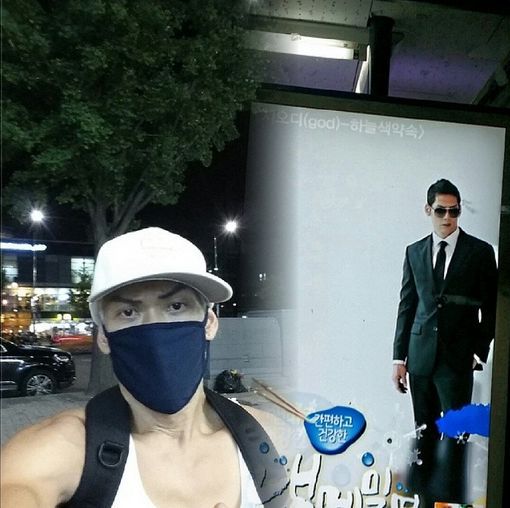 사진 속에는 하얀색 모자와 마스크를 쓴 채 카메라를 응시하고 있는 박준형의 모습이 담겨있다. 특히 박준형은 god 신곡 '하늘색 약속'의 광고 속 자신의 모습을 발견하고 인증샷으로 담아 눈길을 끈다.