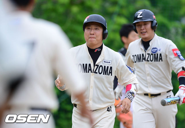 1회초 조마조마 김상호가 2사 주자 1루에서 투런포를 날리고 더그아웃으로 들어 가고 있다.