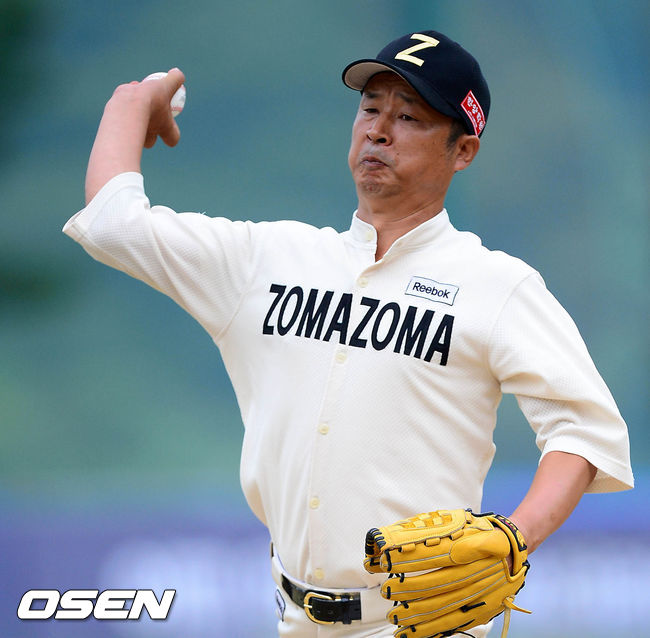 조마조마팀 선발 투수 김장한이 힘차게 공을 던지고 있다.