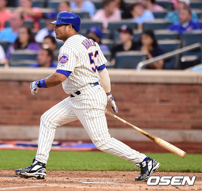 3회말 1사 만루 뉴욕 메츠 아브레유가 1타점 적시타를 때리고 있다.