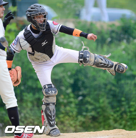 4회초 한빛소프트 포수 김정곤이 도루를 막기 위해 2루 송구를 하고 있다.