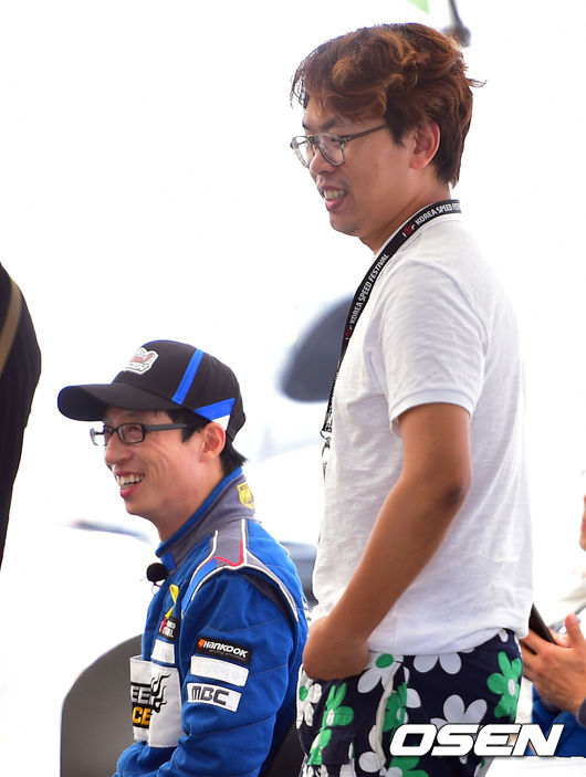6일 오후 인천 연수구 국제업무지구역 인근에서 열린 코리아 스피드 페스티벌(KSF)에서 유재석과 김태호 PD가 대기실에게 경기시작을 기다리고 있다.