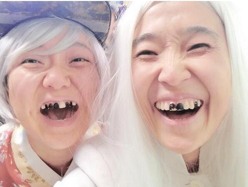 사진 속 둘은 백발 가발을 쓰고 이가 없는 노인 분장을 하고 있어 눈길을 끈다. 분장한 이가 드러날 정도로 웃고 있어 웃음을 자아낸다.