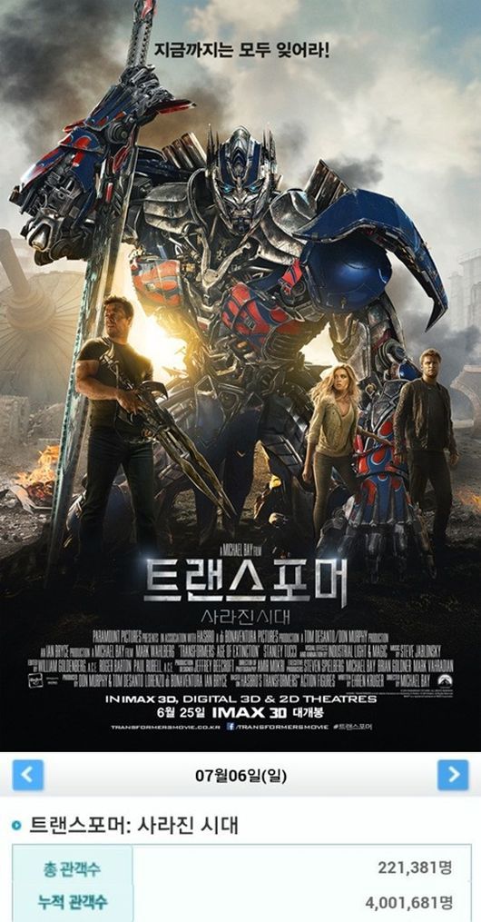 영화진흥위원회 영화관입장권 통합전산망에 따르면 ‘트랜스포머4’는 6일 오후 1시 기준 누적관객수 400만1681명을 동원하며, 개봉 12일만에 400만 관객을 돌파했다.