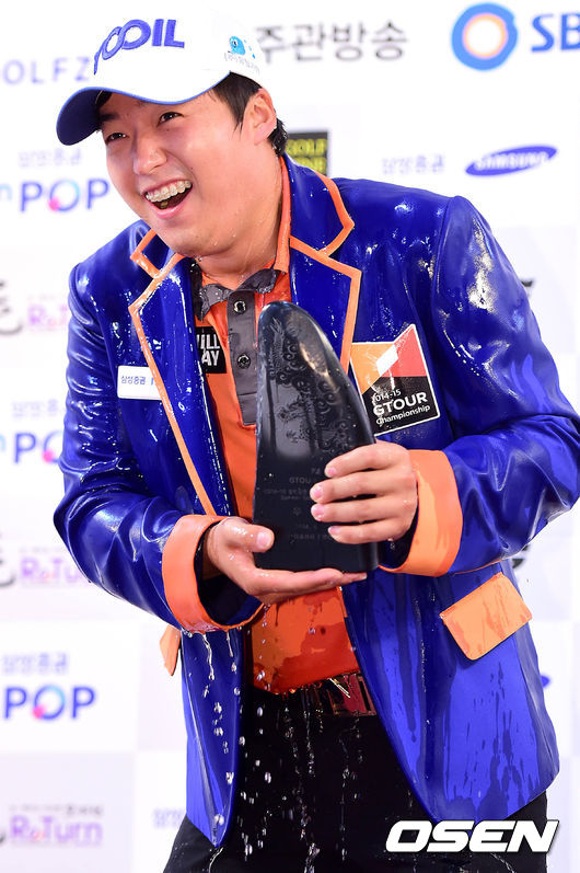 연장 접전 끝에 우승을 거머쥔 공윤식 프로가 시상식에서 트로피를 전달받은 뒤 동료들에게 물세례를 받으며 환하게 미소짓고 있다.