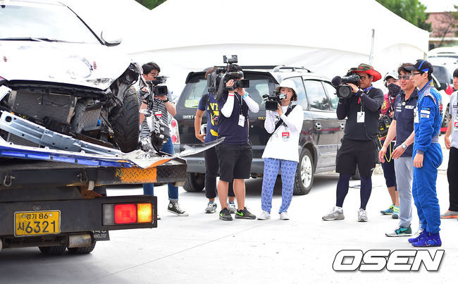 6일 오후 인천 연수구 국제업무지구역 인근에서 열린 코리아 스피드 페스티벌(KSF)에서 기권한 유재석이 자신의 레이싱카를 보며 아쉬워하고 있다.