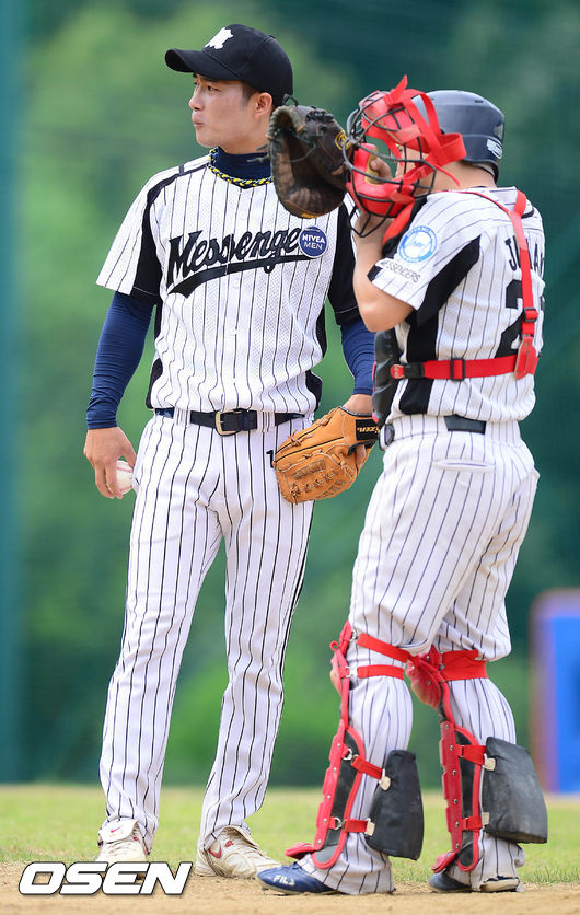 1회초 V-메신져스의 선발 투수 정채원의 계속된 볼넷에 포수 황지만이 마운드를 방문하고 있다.