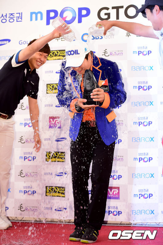 연장 접전 끝에 우승을 거머쥔 공윤식 프로가 시상식에서 동료들에게 축하의 물세례를 당하고 있다.