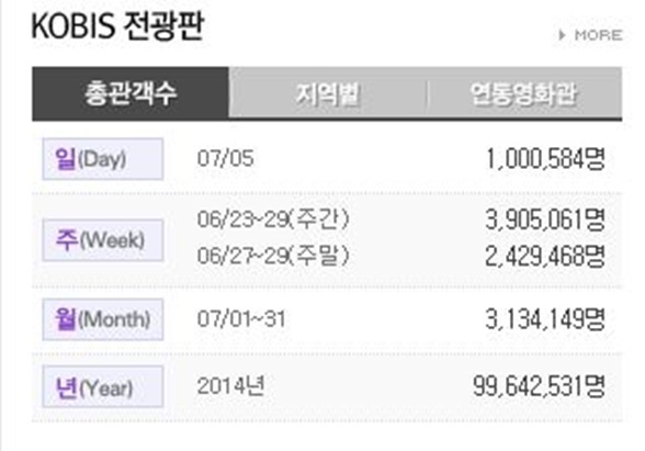 6일 오후 KOBIS 전광판에서 2014년 총 관객수는 99,631,174명을 기록 중이다. 이로써 한국영화 관객수는 내일(7일) 공식적으로 1억명이 넘는 숫자를 보이게 될 것으로 전망되는 것.