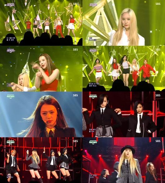 에프엑스는 6일 오후 방송된 SBS '인기가요'에서 정규 3집앨범 타이틀곡 '레드 라이트(Red Light)'와 '올 나잇(All Night)' 무대를 공개했다.