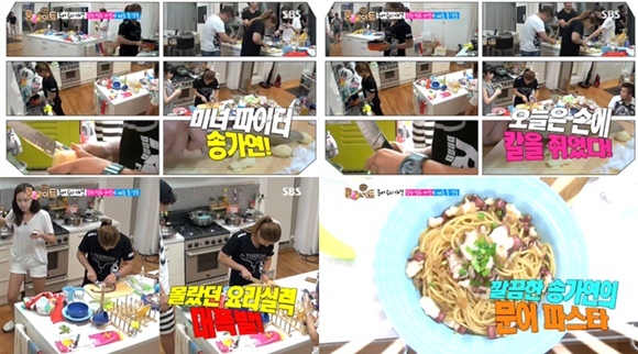 이날 송가연은 홍수현의 팀이 돼 요리 실력을 뽐냈다. 송가연은 파스타 가게에서 아르바이트를 했던 경험을 살려 문어 파스타를 만들었다. 송가연의 파스타를 맛 본 상대팀 박봄 역시 칭찬했을 정도.
