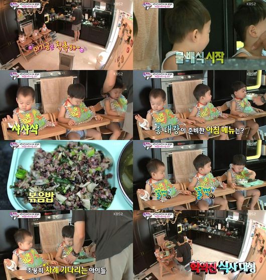 송일국은 아이들에게 아침밥을 먹이기 위해 차례대래 물먹이기, 식판 놓기, 앞수건 둘러주기 등을 해 눈길을 끌었다. 특히 '학익진 대형'으로 아이들을 배치하고 자신이 그 가운데로 들어가 효율적으로 아이들에게 아침밥을 먹여 웃음을 자아냈다.
