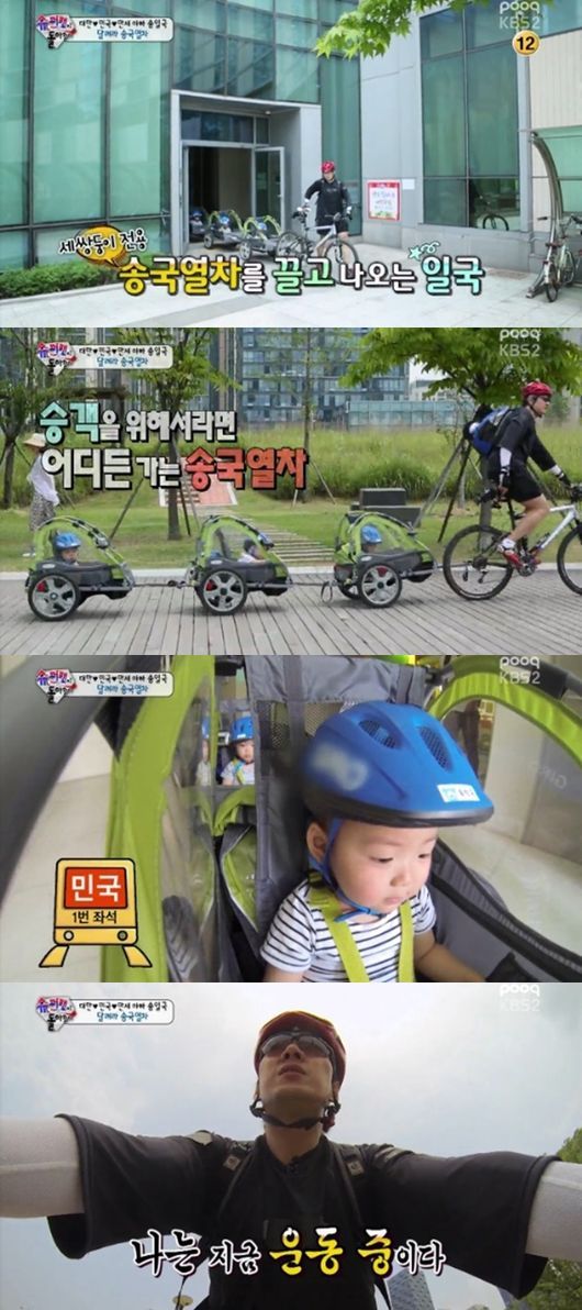 6일 방송된 KBS 2TV 예능프로그램 '해피선데이-슈퍼맨이 돌아왔다'에서는 세 쌍둥이 아들 대한, 민국, 만세와 함께 자전거를 타는 아빠 송일국의 모습이 그려졌다.