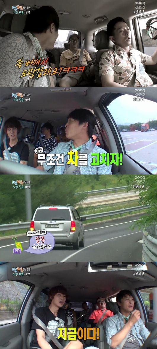 앞서 멤버들은 미션에 실패하면 고속도로에서 도망을 가자는 작전을 짰다. 그리고 실제로 미션에 실패하자 차태현은 “무조건 차를 고치자”고 제안했다. 김주혁 역시 “고치면 안 된다는 룰은 없었다”며 동의했다.