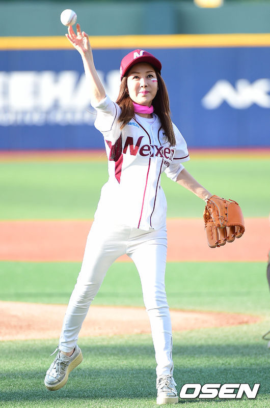 시구자로 나선 배우 박준금이 공을 던지고 있다.