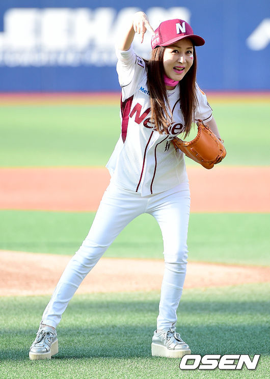 시구자로 나선 배우 박준금이 시타자로 나선 방송인 지상렬을 향해 제스처를 보내고 있다.