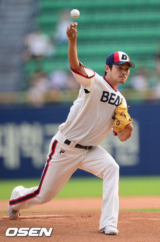 1회초 두산 선발 투수 노경은이 힘차게 공을 던지고 있다.